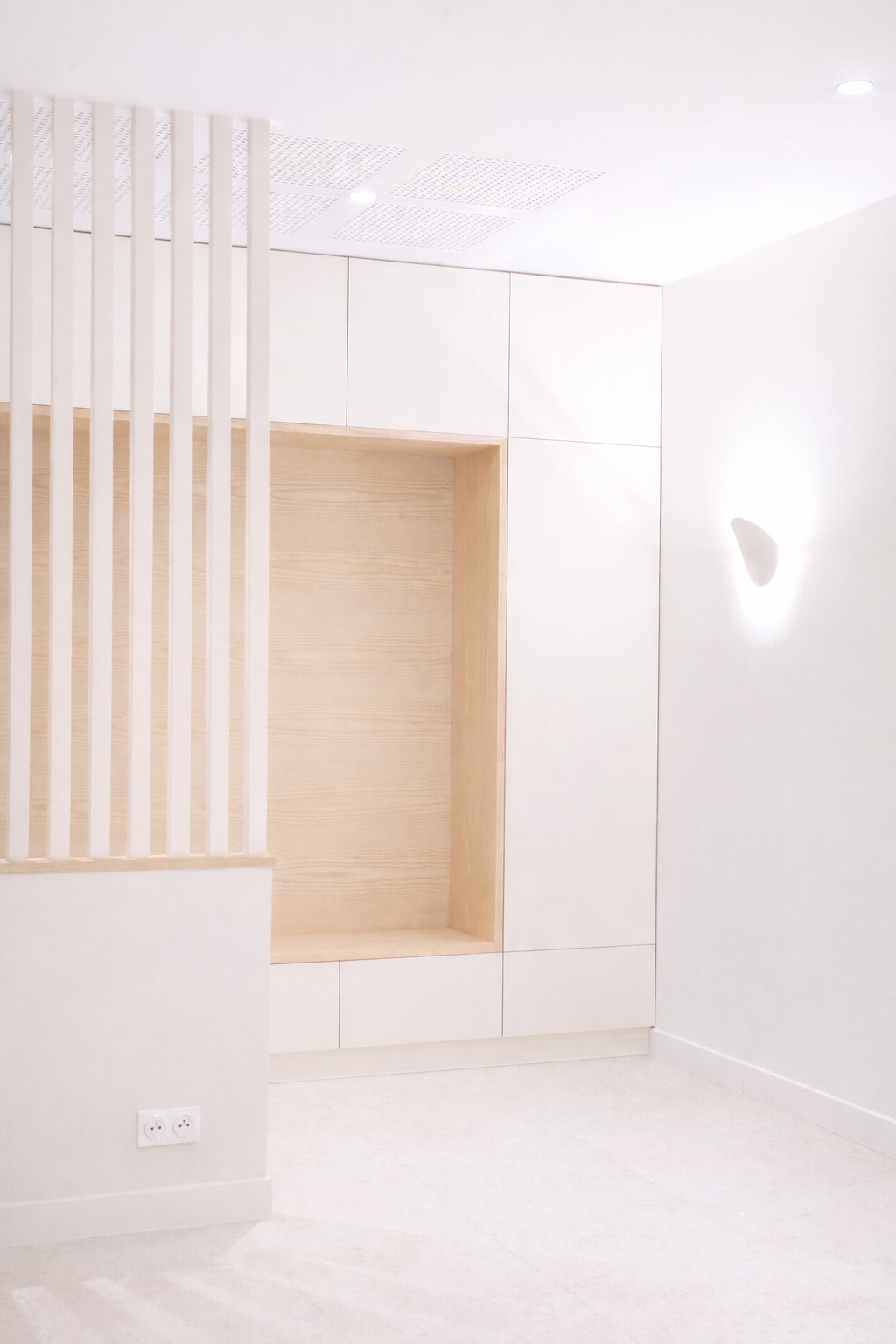 Nous avons opté pour des matériaux sobres, minéraux, avec une palette de couleurs restreinte et des touches de bois. Quinze œuvres d'art de l’artiste Robin Szczigiel viennent agrémenter l'espace.